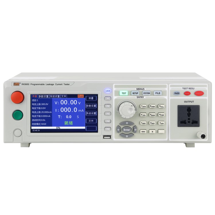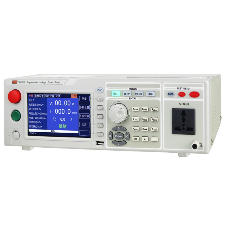 RK9950系列程控泄漏電流測試儀為5寸TFT液晶屏顯示,測試儀采用32位高速MCU和大規模數字電路設計,內置GB9706.1-2007(IEC60601-1:1998)人體阻抗模擬網絡,測試儀具備不合格判別功能、聲光報警功能和測試時間自動控制功能,可滿足生產線或品質檢驗使用需要。">